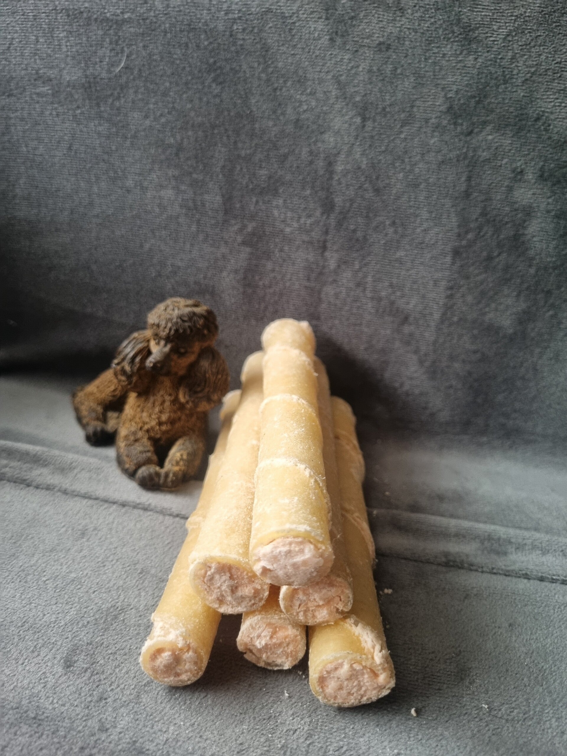 Gevulde Kauwrol. Een tussendoortje van gedroogde runderhuid met een onweerstaanbare zalmvulling.