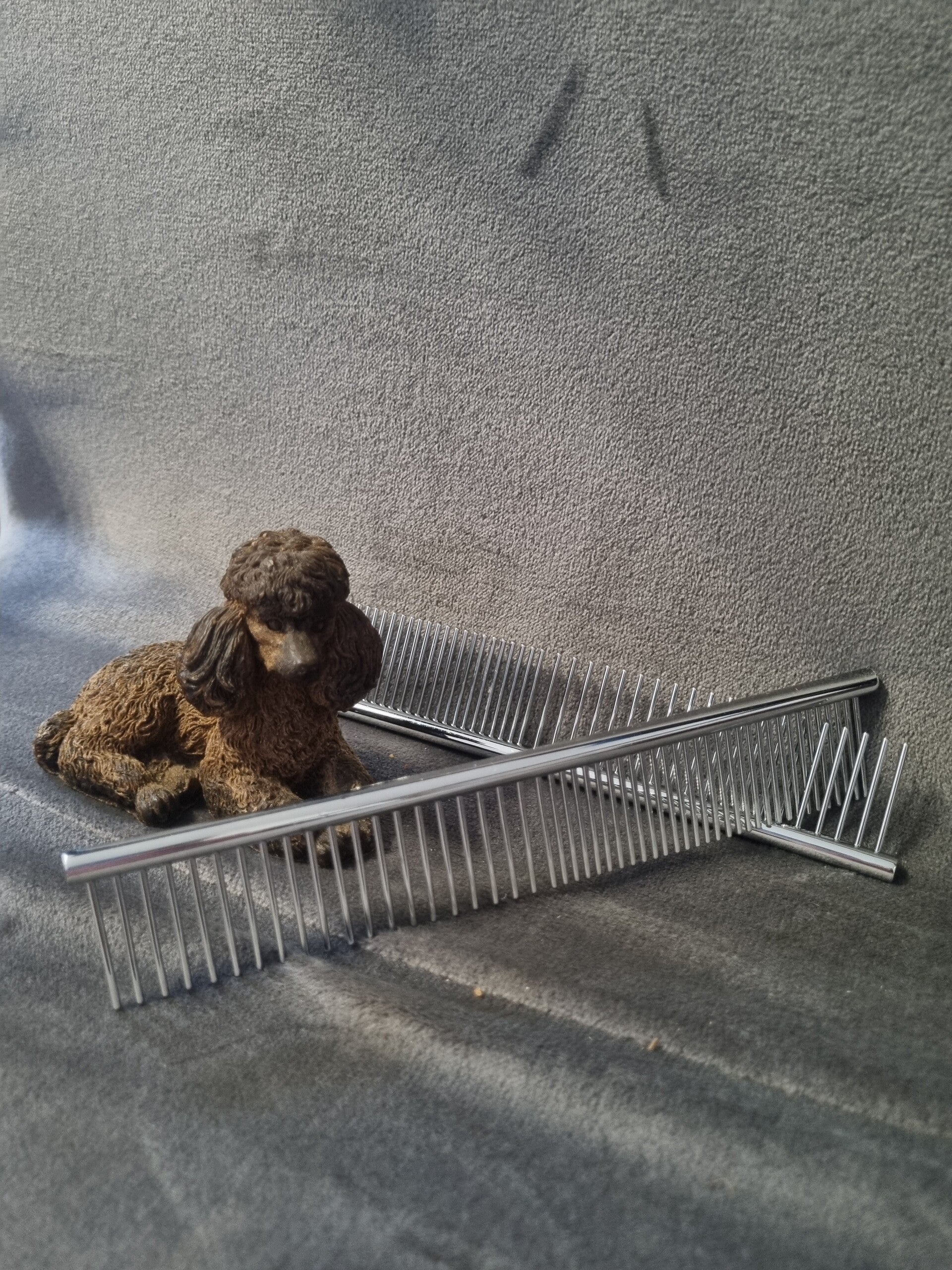 Een precisie-instrument gebaseerd op het originele, klassieke ontwerp maar nu met langere tanden en een iets bredere,platte rug voor meer comfort en een betere grip. Voorzien van mooie ronde tanden, zowel fijn als grof. De Stalen kam is handgemaakt, gechromeerd en gepolijst om de weerstand in de vacht te minimaliseren. Totale lengte is 16.5 cm